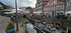 Voordat we het weten bereiken we het eindpunt van vandaag, het plaatsje Stade, ruim 30 kilometer vanaf Hamburg gelegen. Hier hebben we een hotel geboekt, vooral vanwege het feit dat er in het centrum van deze plaats geen camping te vinden is. Stade is een plaats die ons in positieve zin verrast. Het is van oudsher een Hanzestad met een roerige geschiedenis. Denemarken en zelf de Zweden hebben hier in het verre verleden de scepter gezwaaid. Gedurende de 2e wereldoorlog bleef Stade de vele geallieerde bombardementen bespaard, daardoor kent de plaats nu nog een pittoresk centrum; vooral het gedeelte nabij de kleine haven vormt een mooi plaatje met oude vakwerkhuizen die er rondom gelegen zijn.