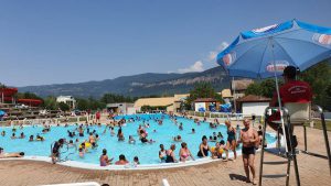 Vandaag verloopt de fietsroute als een speer. Opnieuw vertrekken we lekker vroeg van de camping die nog volledig in slaap is ondergedompeld. We moeten zelf het hek openen om weg te komen, er is nog niemand bij de receptie. Met een geïmproviseerd ontbijtje spoeden wij ons op weg, alles om de warmte voor te blijven. Na een prettige tocht van 53 kilometers komen we aan bij La Vallee Bleue, een keurige camping aan de Rhône. Gelukkig krijgen we heerlijke schaduwplek toegewezen en vrijkaartjes voor het naastgelegen zwemparadijs. Onder de bomen beleven we daar de middag die, zoals gezegd, werkelijk snoeiheet verloopt. Ongelofelijk dat er nog badgasten zijn die midden op de ligwei vol in de zon gaan liggen bakken…