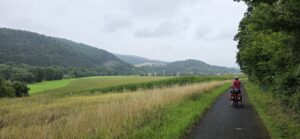 We trekken het regenpak aan en gaan op pad voor een tocht van 70 kilometer. Het regenpak gaat daarna zeker 5x aan en weer uit. Maar tussen de hoosbuien door is het wel degelijk genieten. Sinds we Münden achter ons lieten fietsen we langs de Werra. En da’s wel grappig, want een fietstocht langs deze rivier staat al zeker 20 jaar lang op onze bucketlist. Wij hadden al plannen toen onze kinderen nog meegingen op vakantie, maar telkens was er een reden waarom we er toch niet toe kwamen.