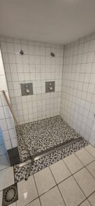 Vandaag hebben we zeker 4x de regenkleding aangetrokken, om deze na niet al te lange tijd ook weer uit te doen. Zonder waterkoeling wordt een regenpak al snel te warm, toch? Daarnaast is er de wind, die vrij stevig is terwijl de temperatuur nou niet echt zomerse waarden laat zien. Kortom: een recept voor vrij veel frissigheid en daardoor telkens weer de vraag:”Gaan we kamperen of niet?” Vandaag besluiten we door te pakken en kiezen voor de camping. We arriveren op de camping in Immelborn, een ietwat desolate camping met nog wat Oost-Duitse trekjes zoals je op de foto van de douches kunt zien.