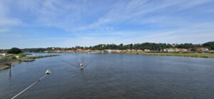 De supermarkten voor de inkoop van de lunch zijn vandaag dun gezaaid, behalve bij het plaatsje Lauenburg. Maar daar moeten we voor een Penny Market een lange en retesteile heuvel op, en gezien de warmte hebben we daar dus geen trek in. Een handvol kilometers verderop wordt ons hongergevoel gestild op een terras met bock- en curryworst. Thuis zou je daar niet aan willen denken, maar dit is Duitsland hè…..😄