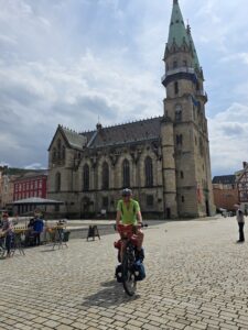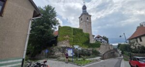Onze lunch doen we op een droog moment in de grotere plaats Straufhain. Bijzonder is daar de grote kerk met een dakbedekking in de vorm van een mozaïek, iets wat sterk doet denken aan gebouwen in de Franse Bourgogne.