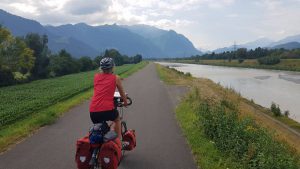 Landschappelijk is het genieten met een grote ‘G’. Links en rechts van de route liggen de grote Alpenreuzen, hoog en ongenaakbaar. Op de fiets hebben we daarvan weinig hinder, we volgen de Rijn (die hier meer een soort halfvol kanaal is) en fietsen daardoor grotendeels vlak. Na de hoofdstad Valduz gepasseerd te zijn verlaten we het ministaatje Liechtenstein en vervolgen we de route in Zwitserland. Hier loopt de route voor een behoorlijk groot deel vrij dicht naast de snelweg en da’s wel een jammertje. Gelukkig blijft de omgeving onveranderlijk mooi, dus dat compenseert een hoop.
