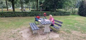 Een klein nadeel: de camping ligt op bijna 95 kilometer van onze huidige verblijfplaats in Ravenstein. Veel meer kilometers dan wat we gewend zijn. We besluiten toch de fietsrit te gaan maken. Eerst nemen we afscheid van Leo en Marja, die ons ‘s ochtends vroeg -op weg naar de douche- aantreffen op de camping waar zij zelf al enkele dagen verblijven. Omdat zij pas gisteravond laat terugkwamen van hun uitstapje naar Nijmegen hebben zij niet meegekregen dat wij ook op dezelfde camping zijn neergestreken. Er volgt een kort maar warm onthaal waarna wij op de fiets stappen voor onze 3e etappe.