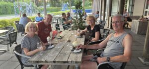 Vandaag voert de reis ons dus van Sneek naar Bakkeveen, dwars door het Friese land. En daar is natuurlijk niets mis mee. Weidse vergezichten, slootjes, sloepjes, zeilbootjes, knusse dorpjes…het is er allemaal. In het dorpje Akkrum besluiten we om even te passagieren. Bij de gezellig drukke haven van dit gehucht zet Petra haar gloednieuwe fiets keurig op slot en….. krrrrrrak! Het handgreepje van het slot breekt volledig af😩. Nog nooit meegemaakt, maar het gebeurt nu wel. Slot onbruikbaar. Wat te doen? René googlet voor de verandering maar weer eens een dichtstbijzijnde fietswinkel ( de 3e binnen 3 dagen) in een poging om de boel snel te (laten) herstellen. Maar dat valt tegen: de werkplaats is gesloten, René kan in de winkel wel een nieuw slot kopen maar moet zelf maar kijken hoe dat op de fiets geplaatst wordt.