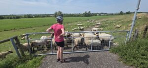 Bij de 2e afzetting is het wel raak. Hier fietsen we -ondanks alle waarschuwingen- heel eigenwijs verder over een net gerenoveerde dijk, tot we na een handvol kilometers alsnog een afsluiting tegenkomen. En die is her-me-tisch afgesloten. We zoeken naar een doorgang en ontdekken tussen alle hekken een kleine mogelijkheid die wel dwars door de tuin van 2 Duitse families gaat. Twijfel, twijfel, wat gaan we doen? We trekken de stoute schoenen aan en wagen de oversteek over privé-grond. Dat loopt goed af. Bij de 3e obstructie, een uurtje later, zijn we volledig kansloos. Het treinspoor wordt onderhouden, alles is dichtgetimmerd alsof het Fort Knox betreft. René puzzelt op zijn Garmin een omweg bijeen die goed uitpakt maar wel enkele extra fietskilometers oplevert.