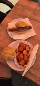 De camping is eenvoudig maar wel voorzien van de eerste levensbehoeften: een goed terras en een imbiss. Na de welverdiende borrel hebben we onze eigen maaltijd bij de tent bijeen gebroddeld ( zalmmoot, voor wie het weten wil) en aangevuld met het moois dat de imbiss nu eenmaal te bieden heeft.