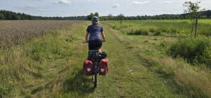 De stadse drukte weten we deze ochtend snel te ontvluchten. Zodra we voorbij het grote stadsbos ‘Bürgerpark’ van Bremen zijn gefietst duiken we weer in de vertrouwde landelijke stilte. En terstond belanden we weer op de inmiddels vertrouwde grindwegen, geitenpaadjes en moddersporen. Om daarover te spreken: De Hanzeroute maakt veelvuldig gebruik van onverharde wegen. Op zich niet erg, maar na het natte weer van de afgelopen tijd zijn deze wel wat lastiger te berijden vanwege plassen en gladheid. We zijn dan ook blij wanneer de ‘cross country’ paden weer ophouden en we over een vertrouwd stukkie asfalt kunnen rijden.
